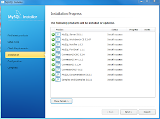 Instal MySQL Langkah 7 - Kemajuan Instalasi: Selesai Mengunduh. Klik tombol Next untuk melanjutkan ...
