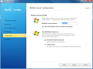 Instal MySQL Langkah 8.1 - Konfigurasi Server MySQL: pilih detail layanan Windows termasuk Nama Layanan Windows dan jenis akun, lalu klik tombol Berikutnya untuk melanjutkan.