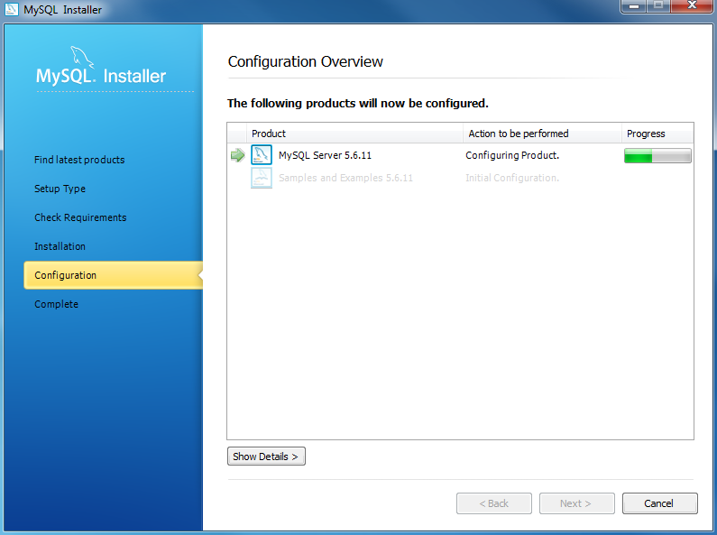 Instal MySQL Langkah 7 - Kemajuan Instalasi: mengunduh Produk sedang berlangsung.